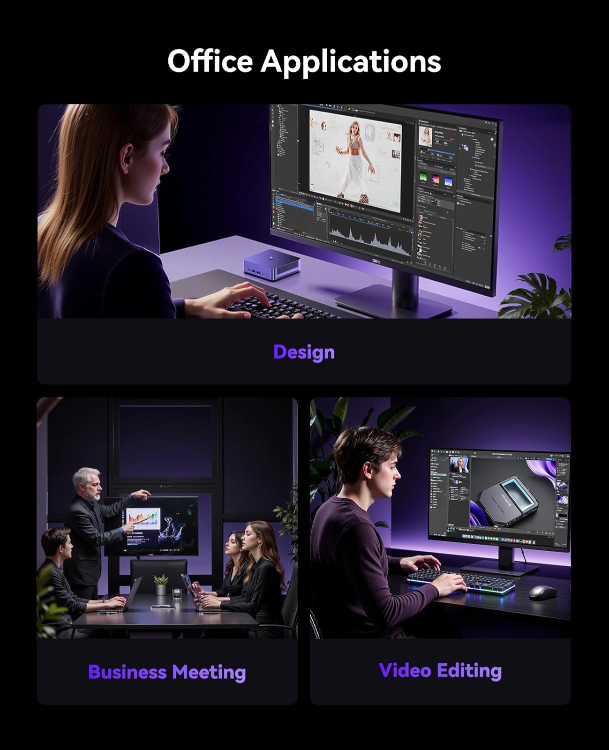 - Prise en charge de l’affichage 4K sur quatre écrans( HDMI 2.1, DP 1.4, USB4),permet de connecter simultanément quatre moniteurs pour améliorer l’efficacité au travail ou créer une expérience de divertissement immersive. Le port USB4(40 Gbps) supporte les cartes graphiques externes ou les périphériques de stockage à haut débit.Que ce soit pour le montage vidéo ou les jeux sur plusieurs écrans, ce mini-PC offre une solution d’affichage flexible.