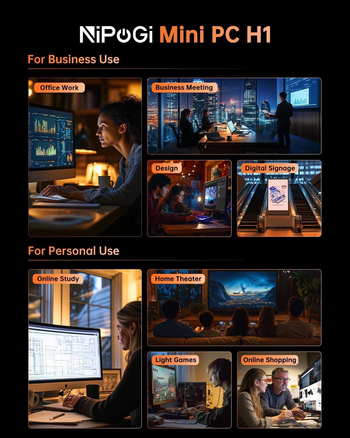 - Conception Compacte,Service Sécurisé : Mesurant seulement 12,9 x 12,9 x 5,1 cm, le NiPoGi H1 offre un montage VESA, ce qui permet de l’installer facilement à l’arrière d’un moniteur ou sur un bureau, vous offrant ainsi un environnement de travail ordonné. NiPoGi se consacre à la recherche et à la promotion de mini PC depuis dix ans. Nous fournissons un service après-vente 24 heures sur 24 et une assistance technique à vie. Si vous avez des questions, n’hésitez pas à nous contacter.